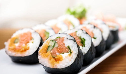 URA – MAKI – ten rodzaj sushi to również zawinięty zrolowany ryż, jednak algi morskie są w środku, a nie na zewnątrz. Na zewnątrz ryż może być obtoczony np. w sezamie.