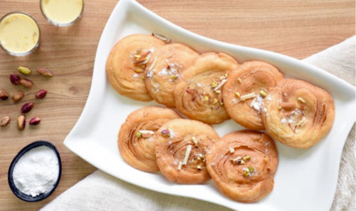 Przygotowanie:Kasze mannę wsyp do miski i powoli zalewaj wodą, cały czas mieszając. Dodaj rozpuszczone masło klarowane z mąką ryżową oraz szafranem. Wyrabiaj ciasto przez około 5 minut, stopniowo dodając cukier puder oraz mleko. Wyrobione ciasto posmaruj z wierzchu olejem i odstaw na bok na 10 do 20 minut. Po tym czasie formuj z ciasta małe krążki i smaż w głębokim oleju na złoty kolor. Odłóż na papierowy ręcznik do obcieknięcia z oleju.