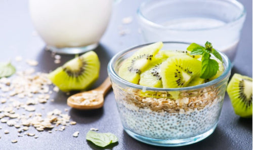 Nasiona chia wymieszać z mlekiem i miodem. Odstawić na około 10 minut. Kiwi obrać i pokroić w pół plasterki. Do miseczek deserowych wyłożyć namoczone w mleku i miodzie nasiona chia. Wierzch posypać płatkami owsianymi, na które następnie wyłożyć pokrojone kiwi. Wstawić do lodówki na około 2 godziny. Smacznego ☺