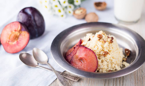 Kaszę jaglana ugotować w mleku. Następnie dodać cynamon, miód i rozdrobnione orzechy włoskie. Całość wymieszać. Przełożyć do miski i obłożyć z każdej strony plastrami śliwek. Posypać z wierzchu cukrem waniliowym