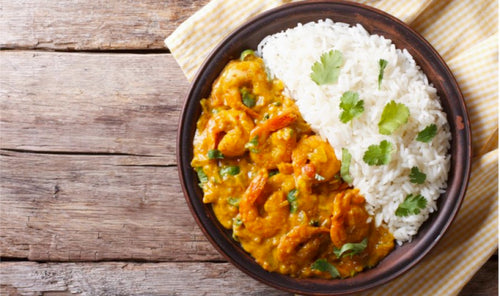 Paprykę czerwoną i żółtą pozbawić gniazd nasiennych i pokroić w drobną kostkę. Na patelni rozgrzać dwie łyżki oliwy z oliwek i wrzucić pokrojoną paprykę. Po około 3 minutach dodać pomidory z puszki. Wymieszać i gotować, cały czas mieszając, przez około 2 minuty. Po tym czasie dodać krewetki, kurkumę, curry i mieloną słodką paprykę. Wymieszać i gotować pod przykryciem przez około 5 minut. Warto co minutę wymieszać danie w trakcie gotowania. Gotowy sos zdjąć z ognia i doprawić szczyptą cynamonu, sola, pieprzem i natka pietruszki. Wymieszać. Podawać z ryżem. Można wymieszać lub podać sos obok ryżu. Smacznego ☺