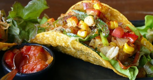 Na dno kukurydzianych tacos wyłóżcie pokrojoną czerwoną cebulę i zielona paprykę. Na górę nałóżcie usmażoną z fasolą wołowinę. Całość posypcie natką pietruszki.