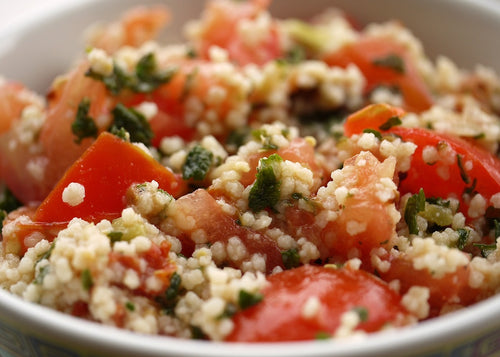 KUSKUS Z PAPRYKĄ, CUKINIĄ, SUSZONYMI POMIDORAMI I NATKĄ PIETRUSZKI