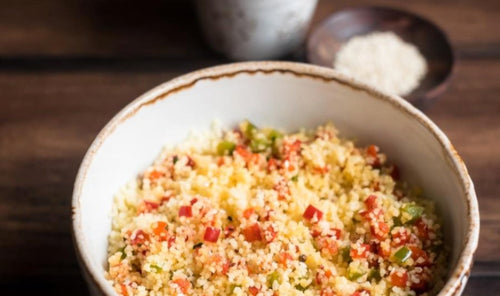 Zagotuj około 1,5 litra wody. Następnie przelej ją do miski i delikatnie posól. Wsyp kuskus i przykryj miskę. Zostaw całość na 5 minut. Po tym czasie odlej nadmiar wody, a kuskus delikatnie rozdrobnij widelcem. Zieloną i czerwoną paprykę pokrój, pozbywając się gniazd nasiennych na bardzo drobną kosteczkę. Tak samo zrób z cebulą i papryczką chili. Na patelni rozgrzej oliwę z pestek winogron. Następnie wrzuć cebulę i smaż ją do momentu, kiedy zrobi się lekko szklista. Teraz dorzuć pokrojone papryki wraz z papryczką chili. Dodaj 2 kawałki suszonego galangalu i trawę cytrynową. Całość duś pod przykryciem około 5 minut. Następnie dodaj sok wyciśnięty z jednej cytryny oraz curry, kurkumę i cynamon. Wymieszaj i znowu duś pod przykryciem około 4 minut. Przygotowane warzywa przerzuć do wcześniej zrobionego kuskus. Wymieszaj całość i dopraw do smaku solą i pieprzem.