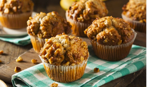 Groch zmielić na mąkę w młynku do kawy. Następnie wymieszać z sodą, proszkiem do pieczenia i solą. Dodać poszatkowane orzechy i wymieszać. Banany obrać ze skórki i rozgnieść widelcem na jednolitą masę. Dodać jajko, cukier oraz olej. Całość wymieszać do połączenia się wszystkich składników. Następnie należy połączyć obydwie masy i dodać sok z cytryny. Wymieszać całość łyżką do uzyskania jednolitej konsystencji. Ciasto przełożyć do papilotek. Piec w nagrzanym do 190 stopni piekarniku przez około 25 minut. Smacznego ☺