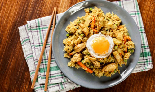 Na patelni rozgrzać olej i wrzucić szalotkę z czosnkiem oraz dodać 1 łyżeczkę pasty chilli. Smażyć około 2 minuty. Następnie dodać marchewkę i pędy bambusa. Smażyć razem, cały czas mieszając, przez kolejne 2 minuty. Po tym czasie wrzucić na patelnię kurczaka i smażyć, aż mięso będzie ugotowane. Dodać ryż, groszek i sos sojowy. Wymieszać i smażyć około 7 minut, co jakiś czas mieszając, na średnim ogniu. Po tym czasie zdjąć z ognia.