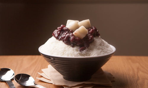 Owoce liczi obrać. Z zamrażalnika wyjąć lód i polać go 3 łyżkami wody. Na wierzch wyłożyć ostudzoną fasolę, a na samą górę położyć owoce liczi.