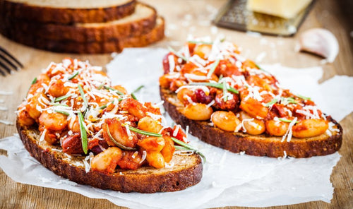 Fasolę namoczyć przez noc. Następnego dnia ugotować do miękkości i ostudzić. Dodać pomidory, oregano i bazylię. Doprawić solą i pieprzem do smaku. Wymieszać całość i przełożyć do naczynia żaroodpornego. Na wierzchu ułożyć gałązki rozmarynu. Wstawić do nagrzanego do 180 stopni piekarnika. Piec przez około 30 minut. Ostudzić. Przełożyć do naczynia i przetrzymywać w lodówce. Idealnie nadaje się na kanapki.