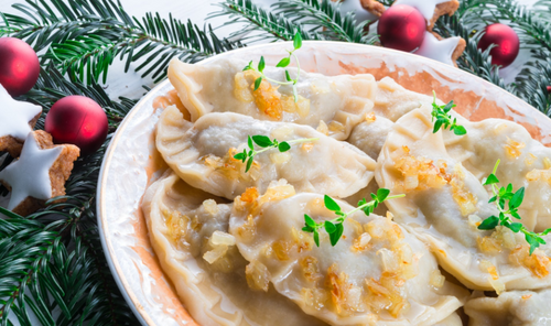 Rozwałkować ciasto i wykrawać kółka, które następnie faszerować kaszą z grzybami. Zlepić rogi. Gotowe pierogi ugotować w osolonej wodzie.