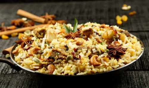 Mięso umyj i pokrój w drobną kostkę. Czosnek drobno pokrój i dodaj do jogurtu razem z imbirem. Polej nim pokrojone mięso. Całość włóż do wolnowaru i gotuj około 4 godzin na 2 stopniu. Do szklanki wrzuć cynamon, kardamon, goździki, pieprz oraz gwiazdki anyżu. Całość zalej wrzątkiem. Do brytfanny wlej olej i dodaj posiekaną drobno cebulę. Zeszklij. Dodaj kmin i duś całość pod przykryciem przez 3 minuty. Następnie wlej wodę wraz z przyprawami. Zagotuj i duś przez około 4 minuty. Dodaj do brytfanny ryż, mięso oraz wodę i sól. Wymieszaj i zagotuj. Następnie przykryj brytfannę i wstaw do nagrzanego do 150 stopni piekarnika. Piecz przez około 45 minut. Przed podaniem posyp danie orzechami nerkowca. Smacznego ????