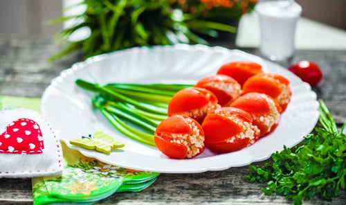 Nafaszerowane pomidorki ułóżcie na górze talerza. Połóżcie szczypior, który będzie imitował łodygi.