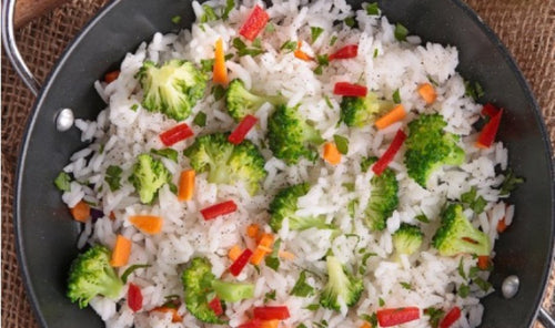 Ryż ugotować według instrukcji na opakowaniu. Warzywa umyć. Marchewkę obrać i pokroić na drobne pręciki. Tak samo pokroić paprykę. Do szklanki wlać 6 łyżek oliwy z oliwek i wsypać majeranek oraz zioła prowansalskie, oraz sól i pieprz. Wymieszać i następnie zalać umyte i osuszone warzywa. Ręką wymieszać warzywa, żeby idealnie połączyły się z dresingiem. Następnie ugotować je na parze. Na koniec wymieszać warzywa z ugotowanym ryżem. Smacznego ☺