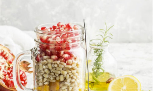 Kaszę ugotuj według instrukcji na opakowaniu. Na dno słoika wyłóż trochę pieczonej dyni, następnie połóż warstwę kaszy. Na wierzch wyłóż pestki granatu. Całość polej cytryną i oliwą z oliwek. Z przepisu powinny wyjść dwa sporej wielkości słoiki. Pamiętajcie, że przy przygotowaniu należy rozdzielić równomiernie oliwę i sok z cytryny na każdy ze słoików. Powinno przypadać po 1 łyżce oliwy z oliwek na słoik i po jednej połówce cytryny na słoik. Smacznego ☺