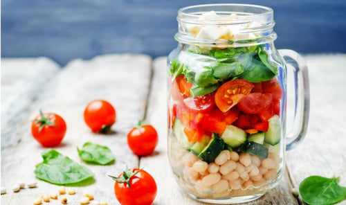 - Do słoika wkładamy kolejno fasolę białą drobną, ogórek, paprykę, pomidor, a na wierzch układamy umyty szpinak, na który kładziemy pokrojoną fetę. Słoik zakręcamy.