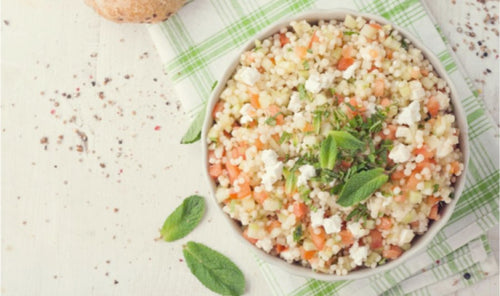 Sałatka z kuskusem, pomidorami, ogórkiem i miętą