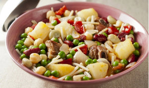 Wieprzowina z czerwoną fasolą, groszkiem, ciecierzycą i ziemniakami.