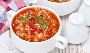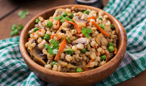 Kasza jęczmienna z pieczarkami, groszkiem i marchewką