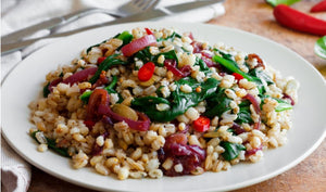 Kasza jęczmienna z chilli, szpinakiem i cebulą