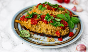 Bakłażan nadziewany kaszą bulgur z pomidorami i bazylią