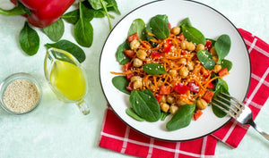 Lekka sałatka z ciecierzycą, marchewką, szpinakiem i sezamem