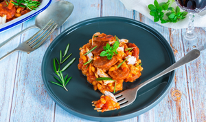 KASZA JĘCZMIENNA Z CHORIZO, KURCZAKIEM I POMIDORAMI