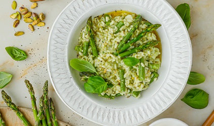 Wiosna to czas, kiedy na naszych stołach zaczynają królować świeże warzywa. Jednym z najważniejszych bohaterów tego sezonu są szparagi, które zyskują na popularności dzięki swojemu wyjątkowemu smakowi i wszechstronności w kuchni. Dziś zapraszamy Was do przygotowania wykwintnego risotto ze szparagami oraz pesto bazyliowo-pistacjowym. To danie nie tylko zachwyca smakiem, ale również wyglądem - delikatne, zielone szparagi w połączeniu z kremowym ryżem arborio i aromatycznym pesto tworzą harmonijną kompozycję, która zadowoli nawet najbardziej wymagające podniebienia.
