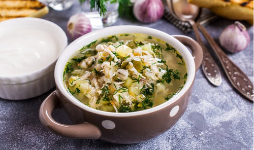 Do garnka wlać bulion warzywny i zagotować. Dodać lubczyk i kaszę jęczmienną. Gotować całość przez około 20 minut.