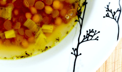W oddzielnych garnkach gotujemy do miękkości pokrojoną w talarki marchewkę i pietruszkę.Następnie przygotowujemy bulion. Kiedy zacznie już wrzeć, dodajemy do niego dodajemy pokrojonego w pionowe paski pora.W oddzielnym rondelku podsmażamy na oleju z pestek winogron pokrojone w kosteczkę cebulę i czosnek. Gdy już wystarczająco się zarumienią, dorzucamy je do bulionu z porem. Dodajemy do wywaru suszony lubczyk, majeranek oraz niewielką ilość soli i pieprzu. Całość łączymy z opłukaną pod zimną, bieżącą wodą soczewicą. Gotujemy wszystko przez około 20 minut. Jeżeli po skosztowaniu brakuje nam soli lub pieprzu, doprawiamy według uznania.